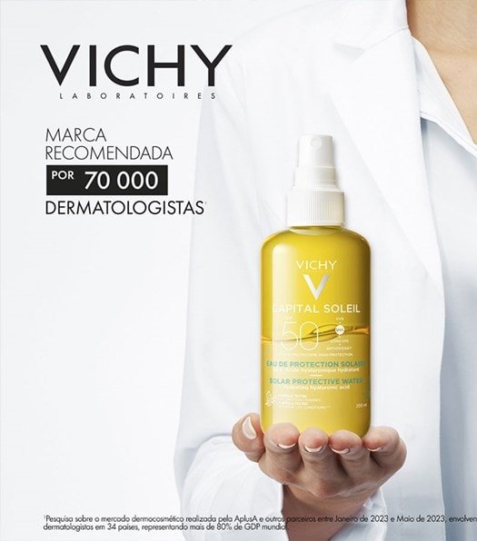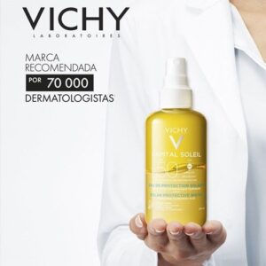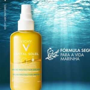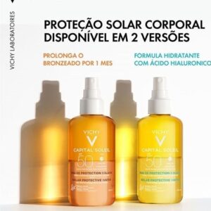 A Água Solar Protetora Iluminadora Corporal Vichy Capital Soleil FPS 50 contém 200 ml, prolonga o bronzeado por 1 mês. Com textura aqua-fluida bifásica leve como água, rápida absorção, é indicada para todos os tipos de pele.