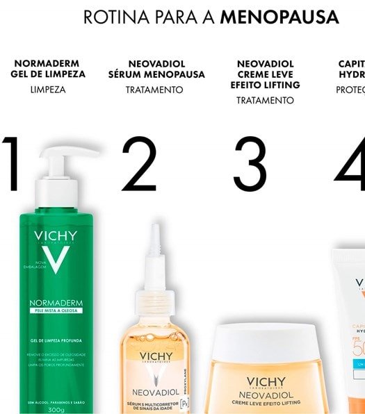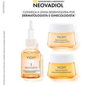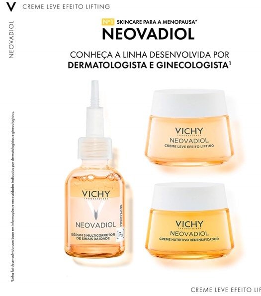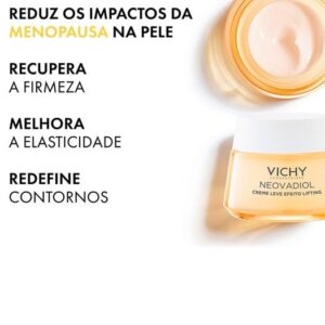 O envelhecimento da pele acelera na menopausa, uma fase da vida marcada por variações hormonais, que intensificam os 5 sinais de envelhecimento visíveis nessa fase: rugas, flacidez, perda de densidade, tom irregular e pele ressecada. Desenvolvido para reduzir os impactos da menopausa na pele, a linha Vichy Neovadiol Menopausa é a Nº1 skincare para menopausa¹. O Neovadiol Creme Leve Efeito Lifting reduz os impactos da pele na menopausa.